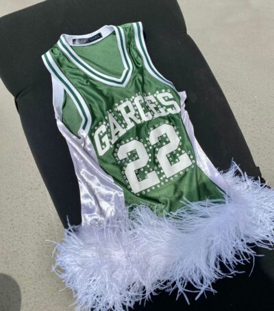 Upcycled green jersey with white ostrich feathers