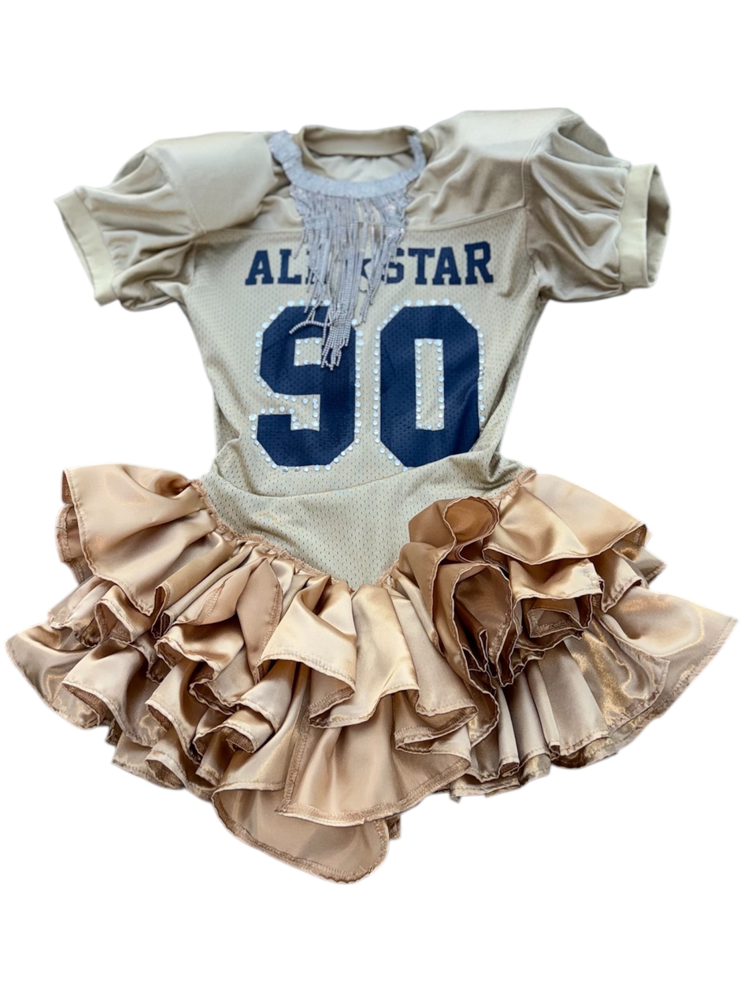 Vintage jersey that has been upcycled into the dress and adorned with ruffles, patches and rhinestones creating a unique, one-of-a-kind piece.