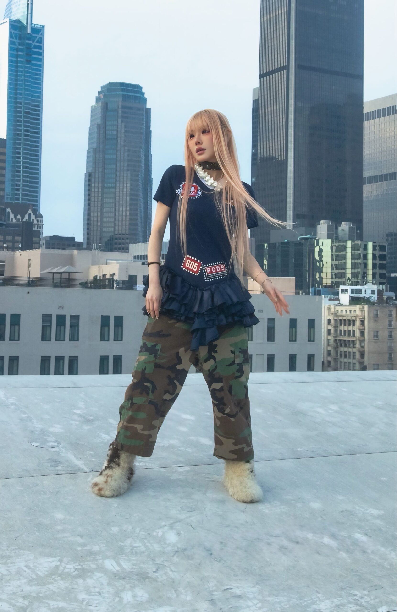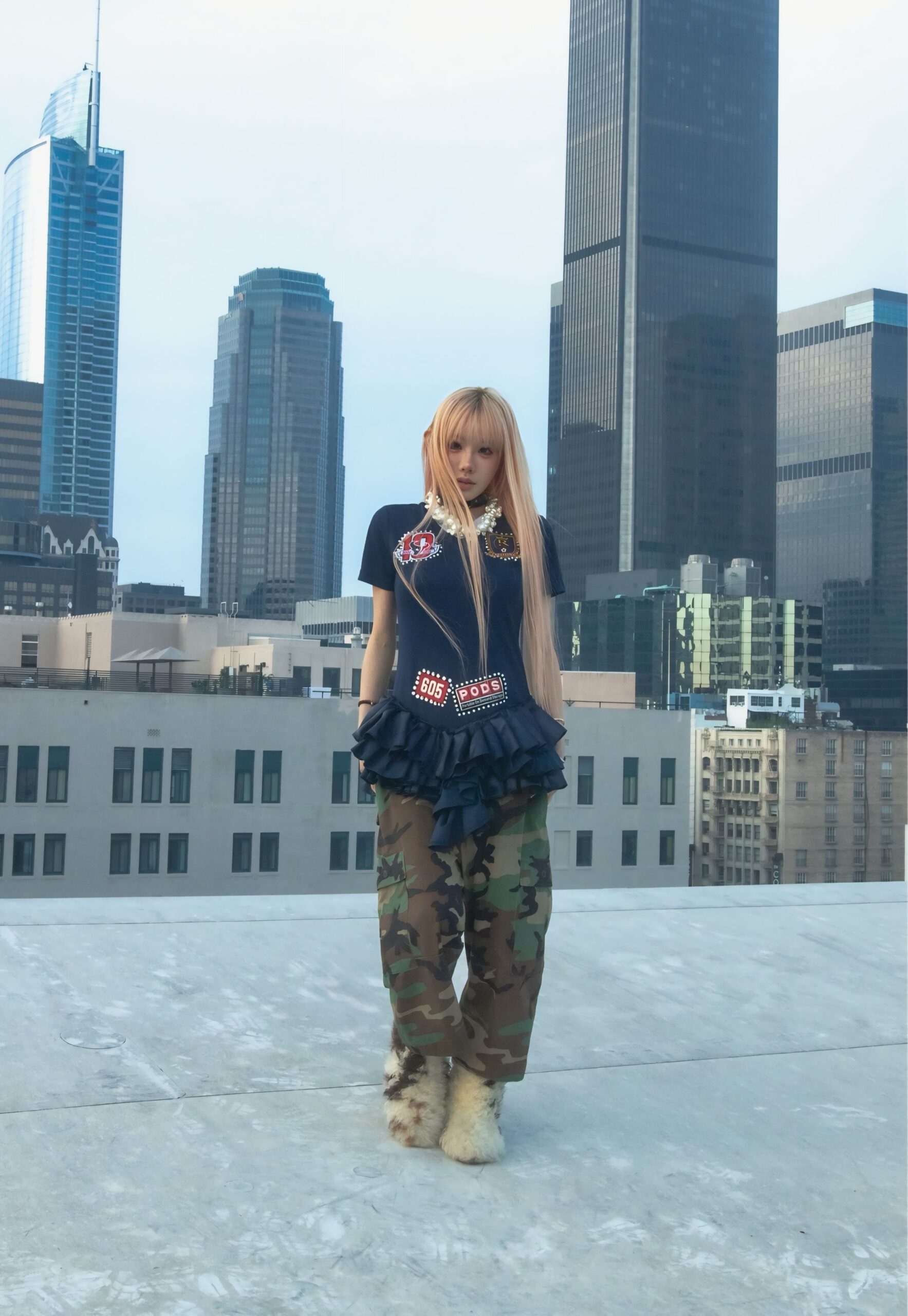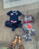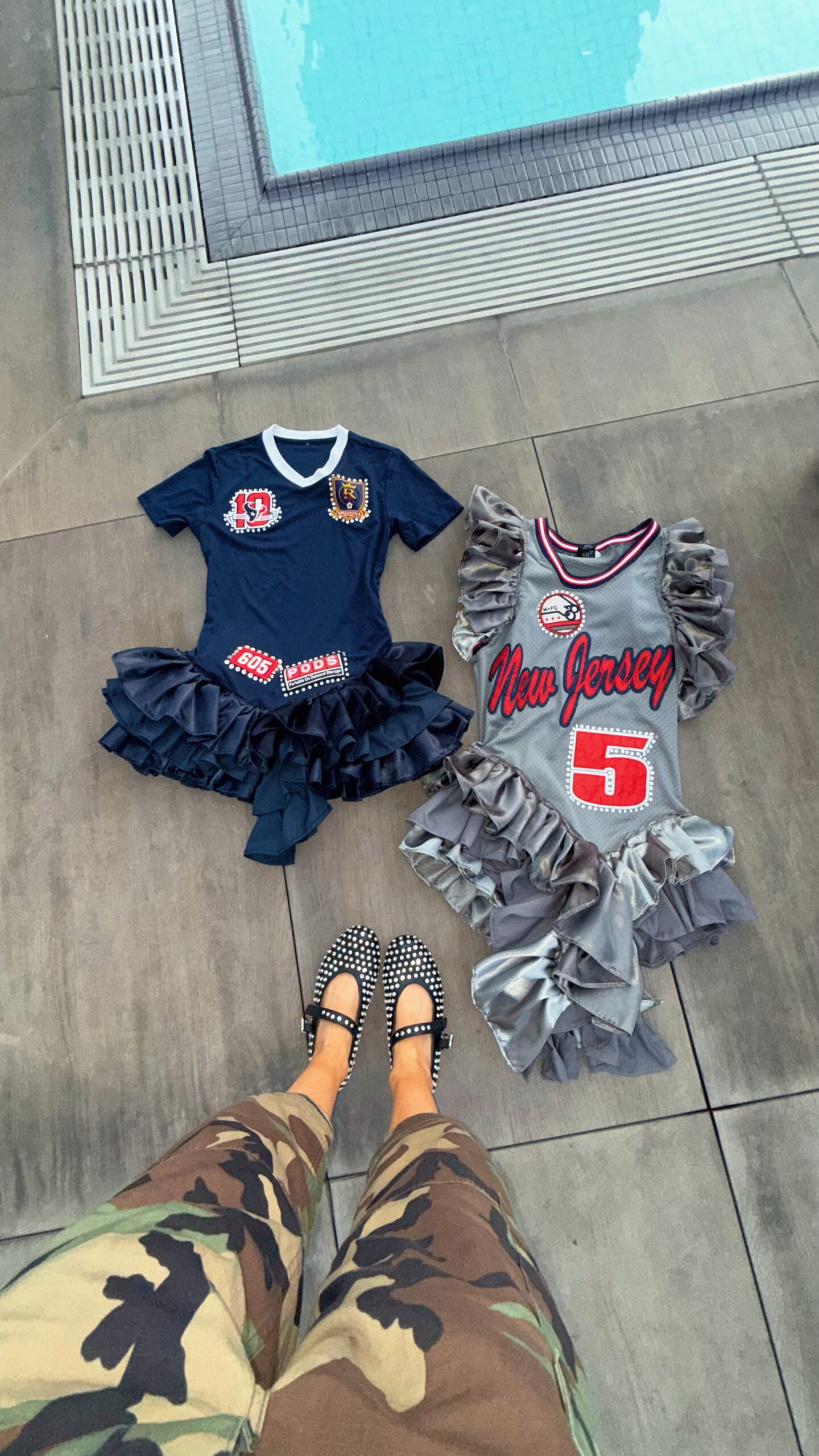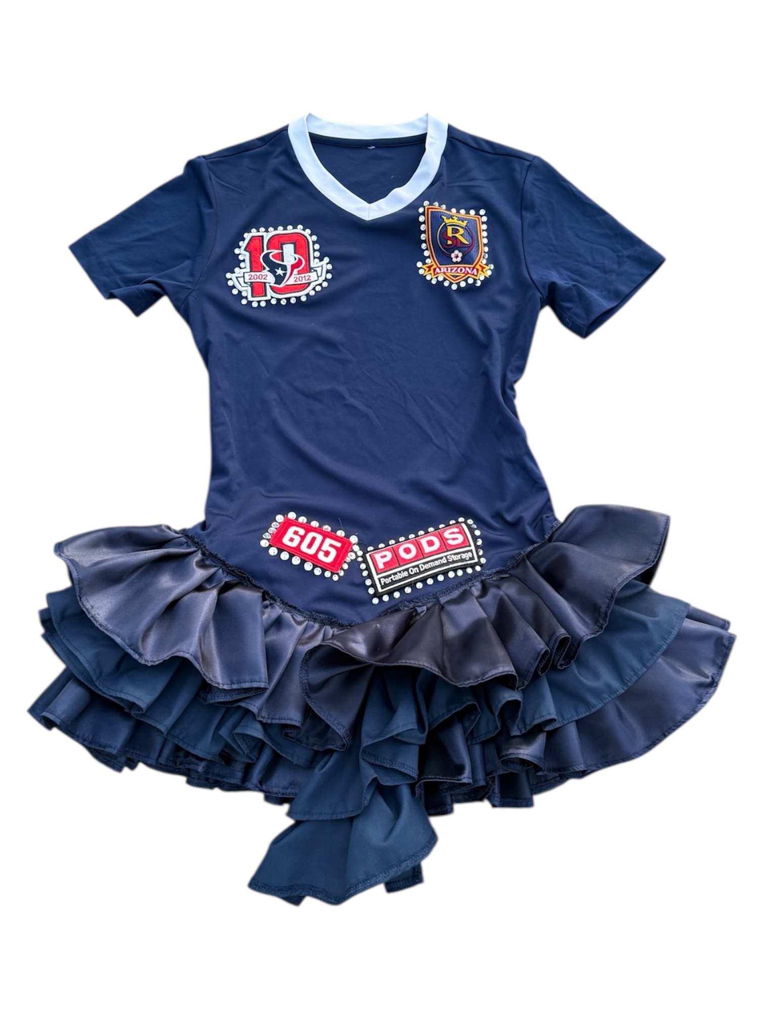 Vintage jersey that has been upcycled into the dress and adorned with ruffles, patches and rhinestones creating a unique, one-of-a-kind piece.