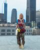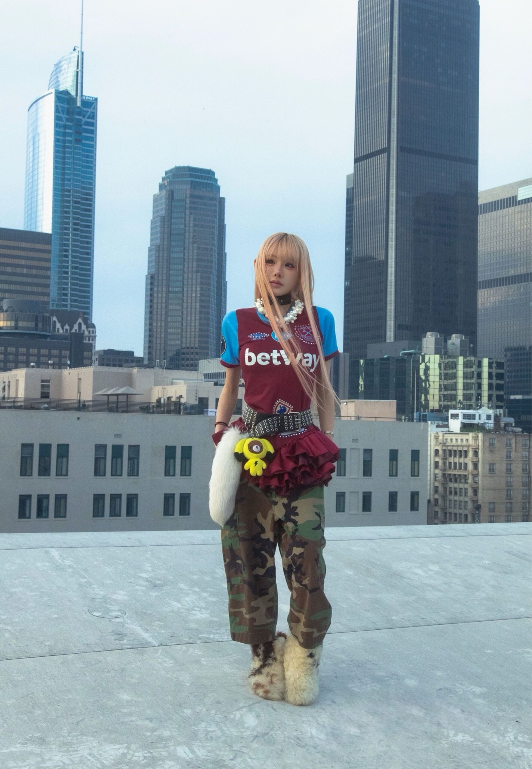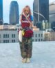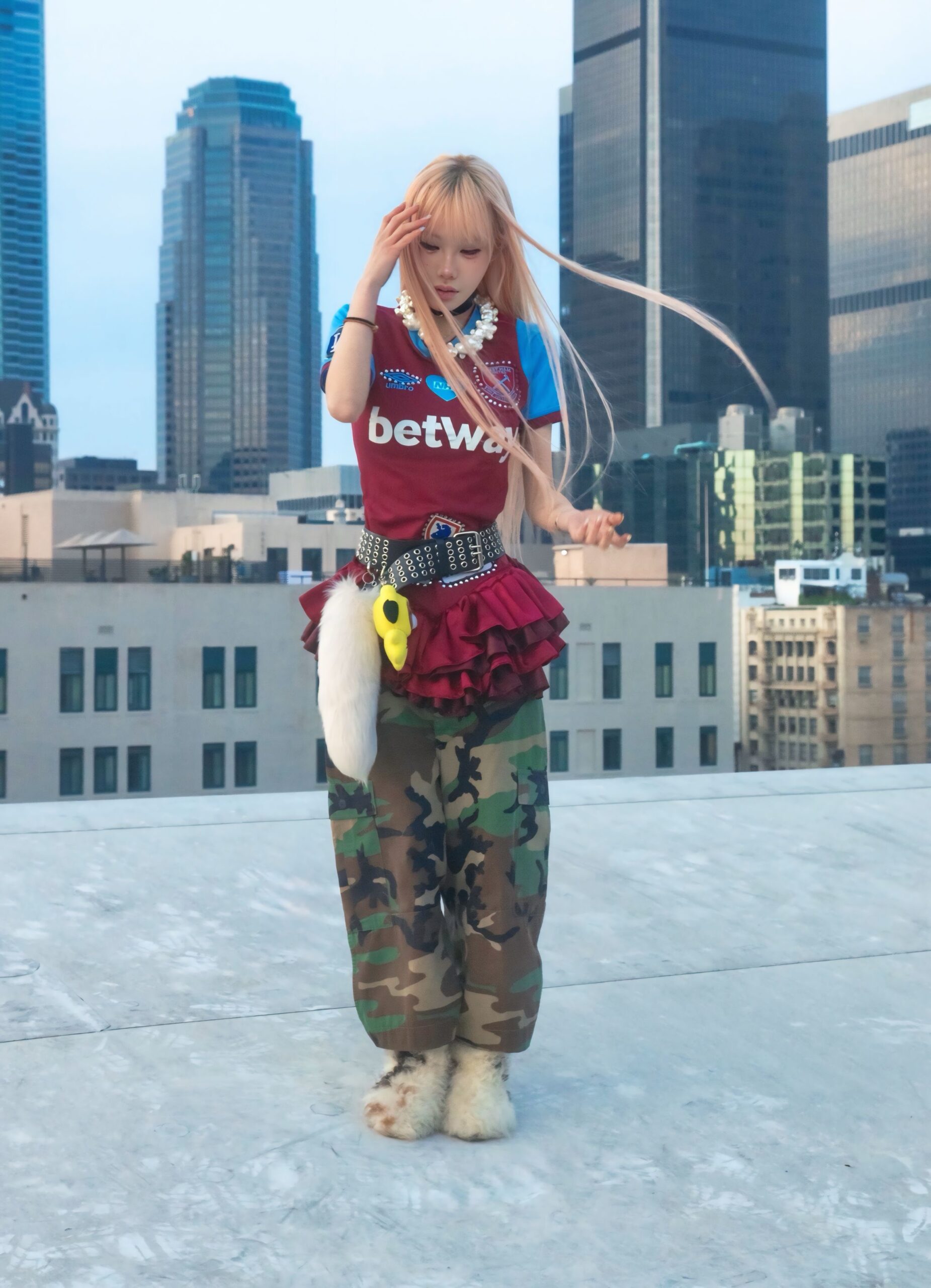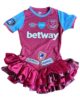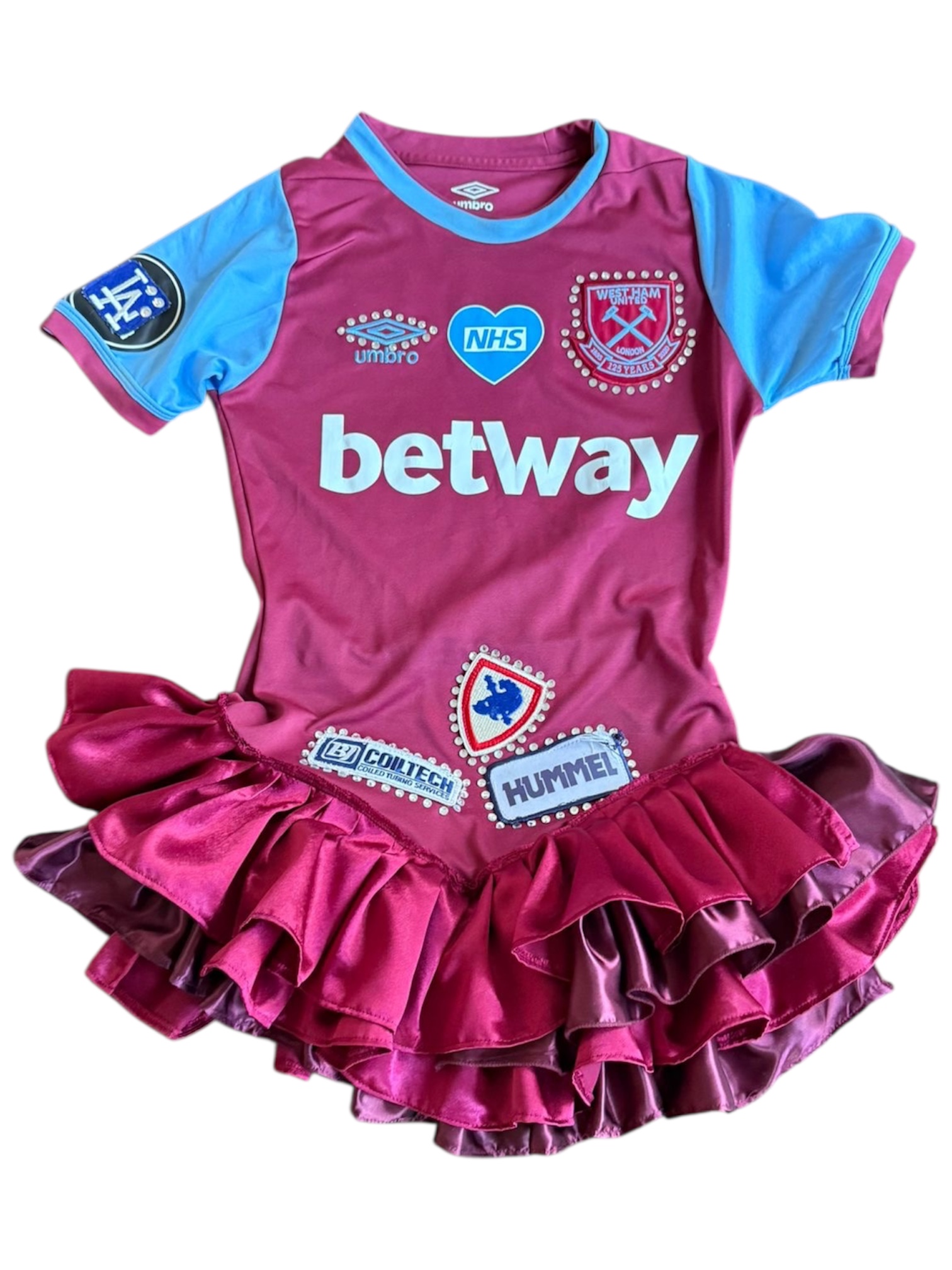 Vintage jersey that has been upcycled into the dress and adorned with ruffles, patches and rhinestones creating a unique, one-of-a-kind piece.