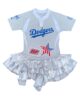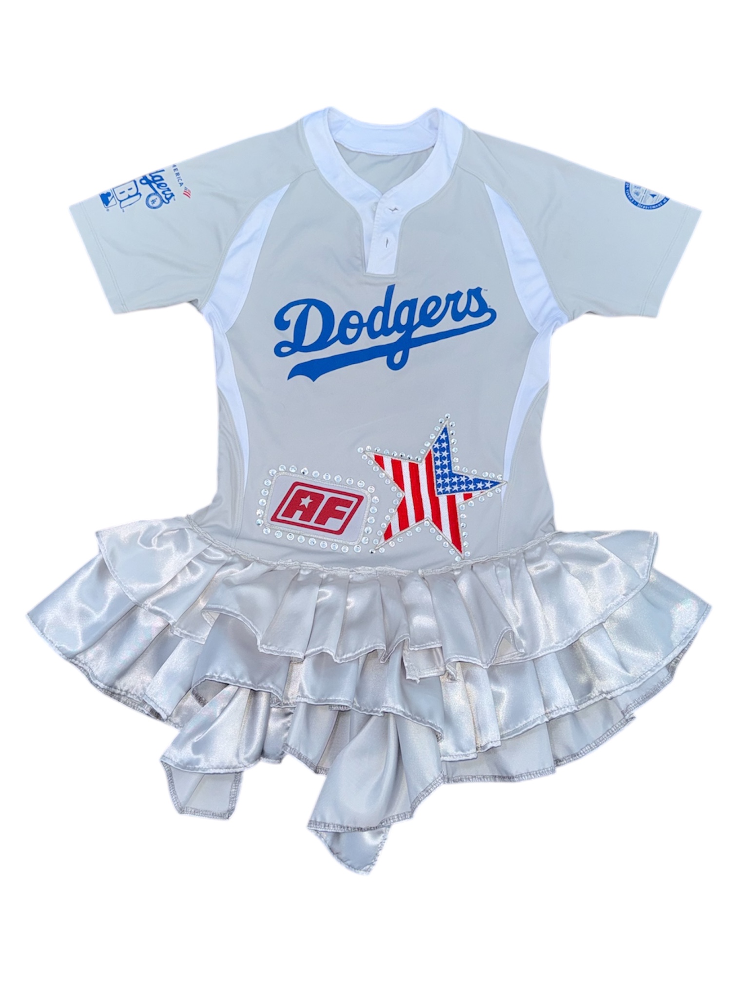 Vintage jersey that has been upcycled into the dress and adorned with ruffles, patches and rhinestones creating a unique, one-of-a-kind piece.