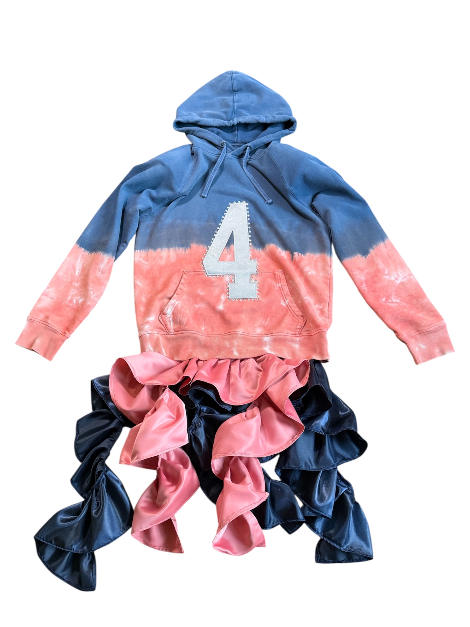 Vintage tie die hoodie that has been upcycled and adorned with ruffles and rhinestones, creating a unique, one-of-a-kind piece