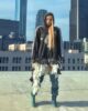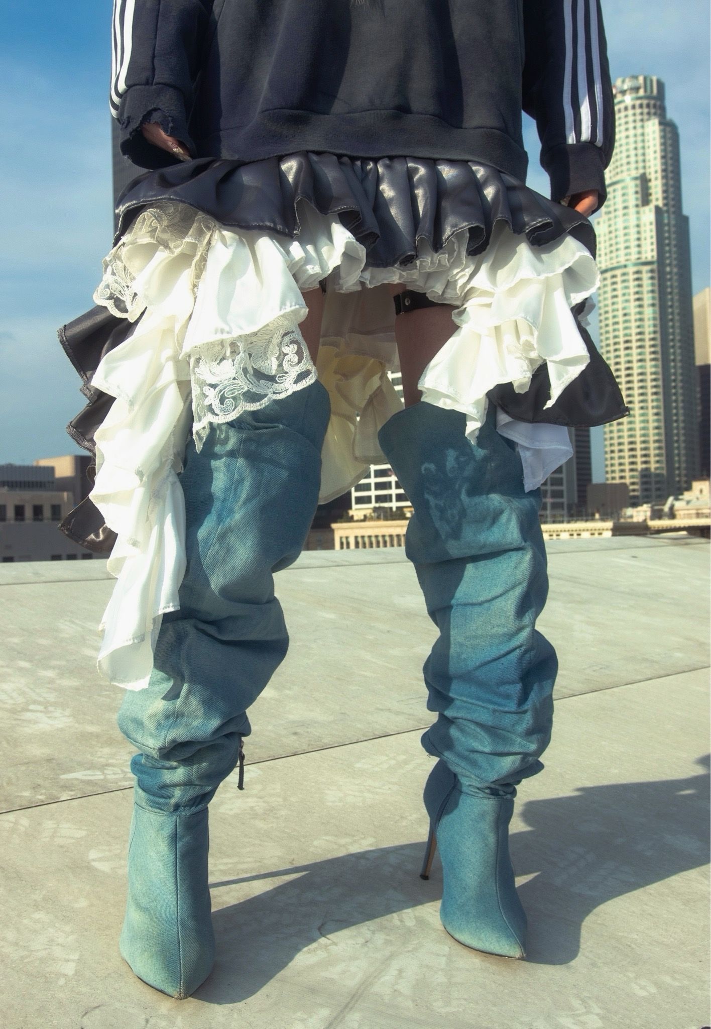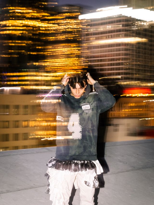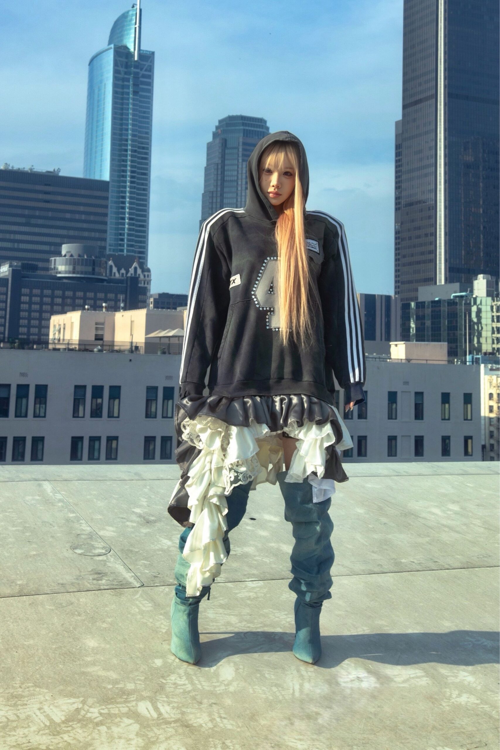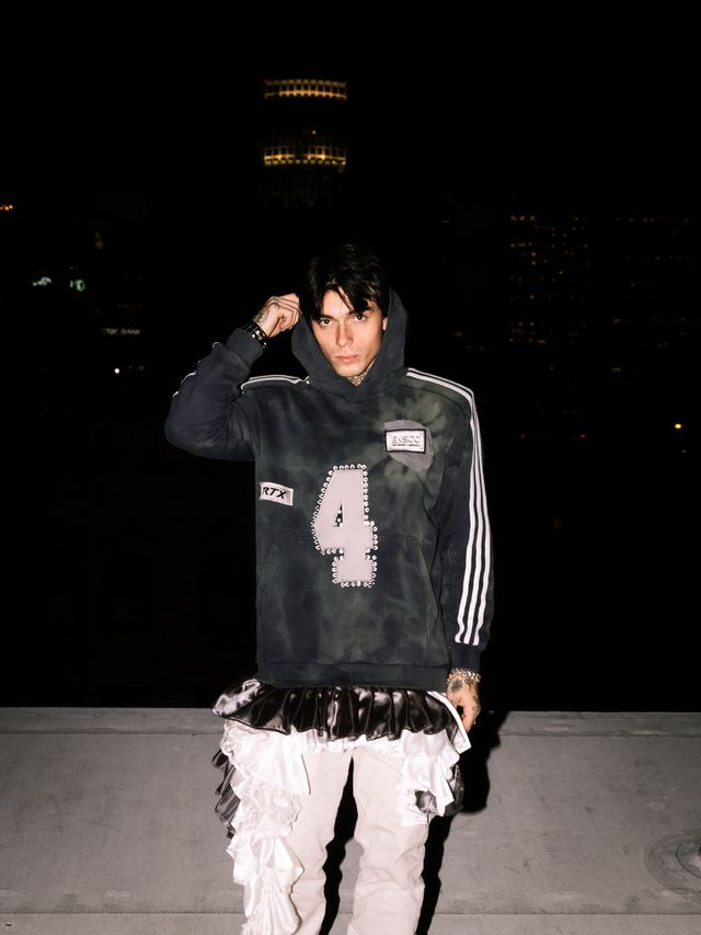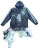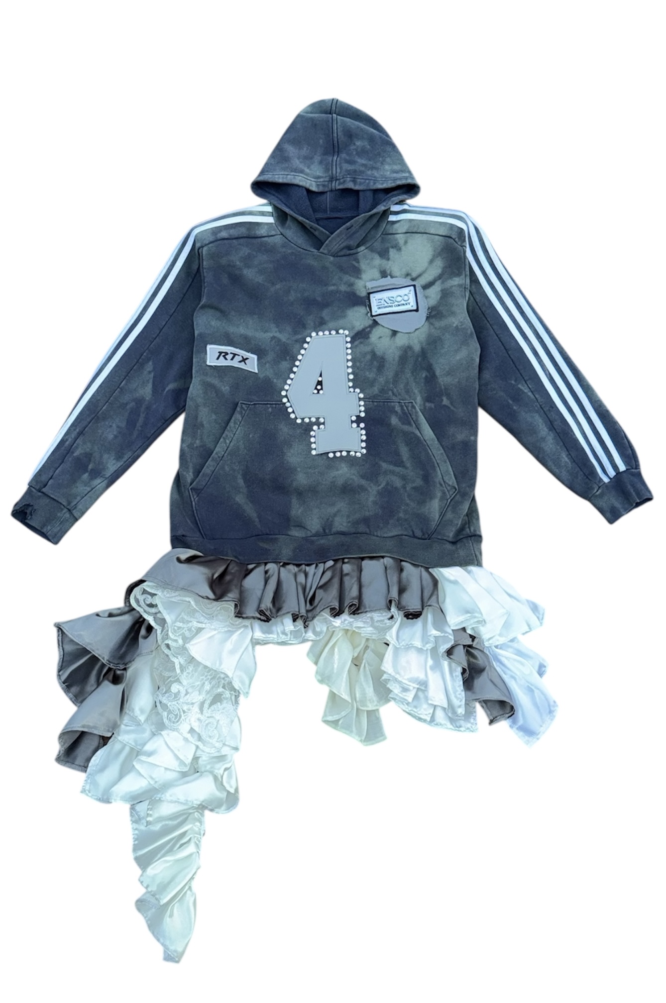 Upcycled unisex hoodie adorned with ruffles, rhinestones and patches creating and a unique, one-of-a-kind piece