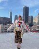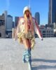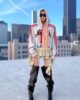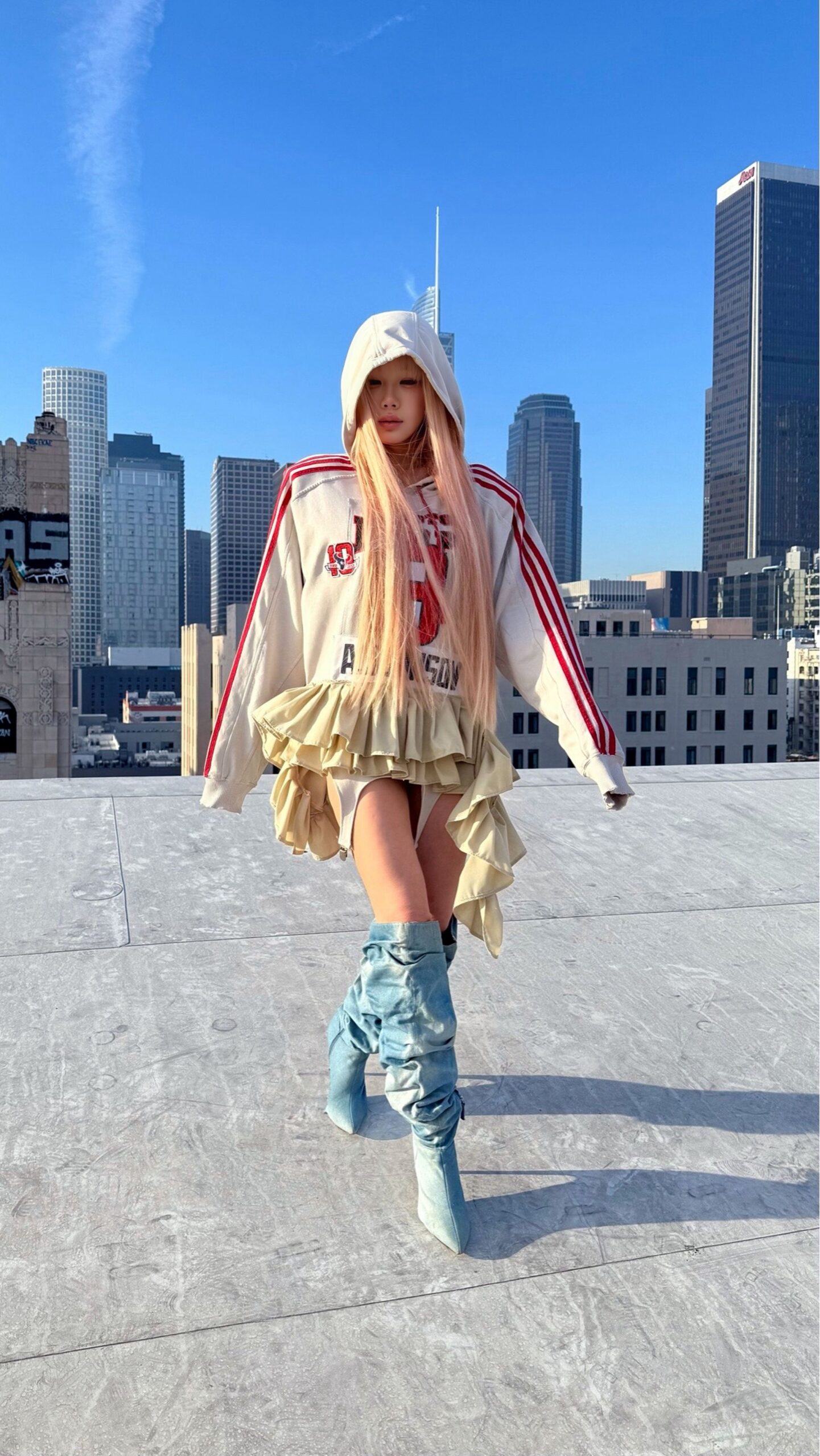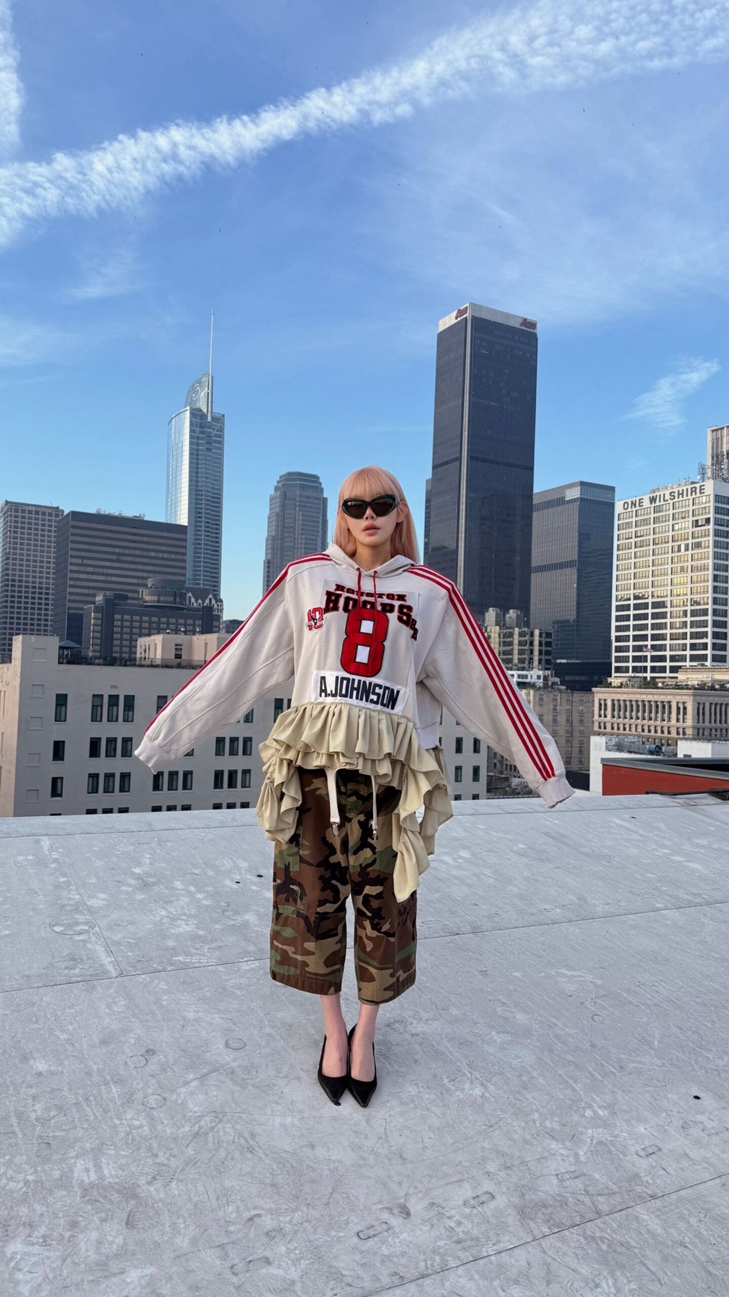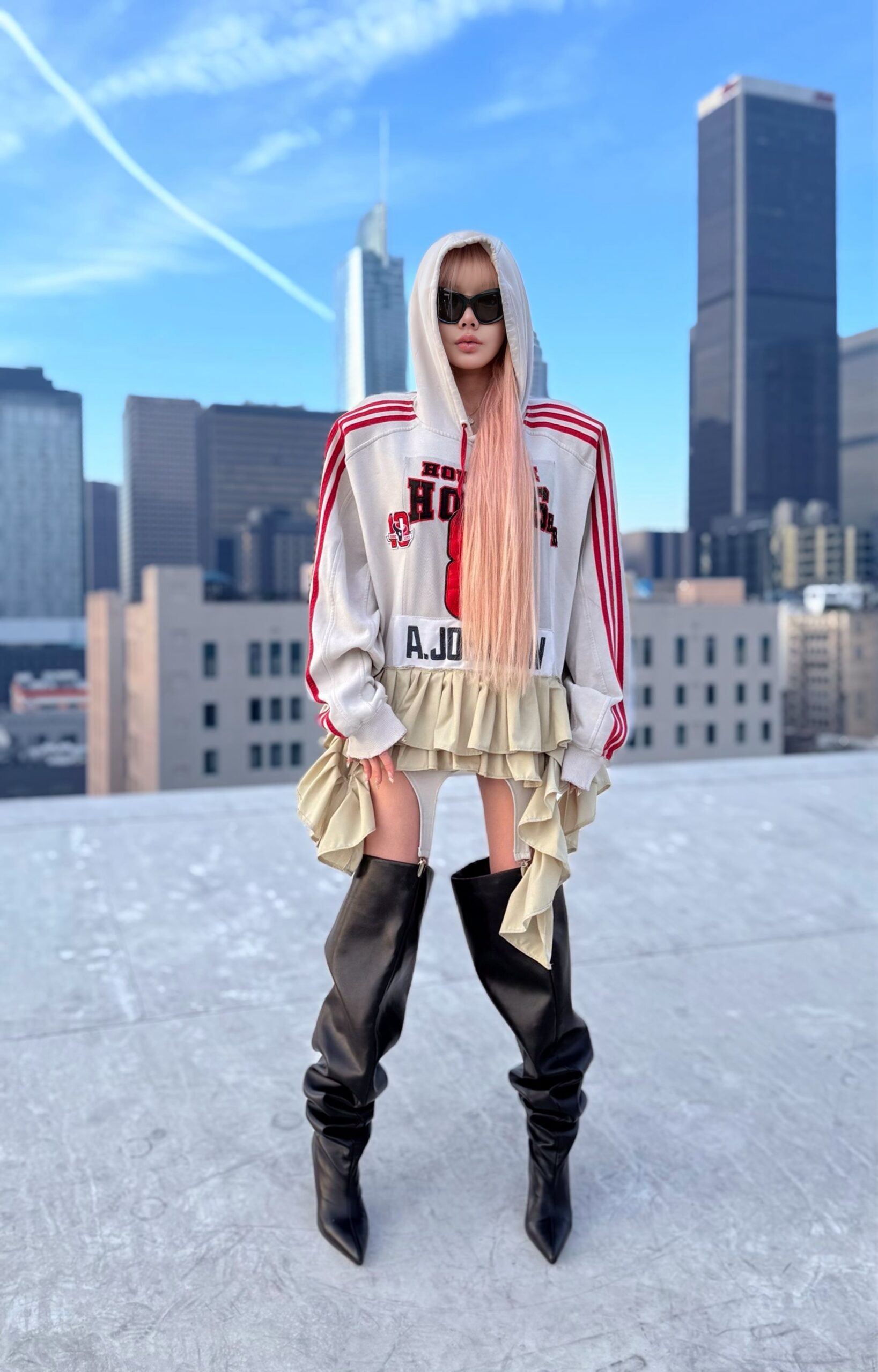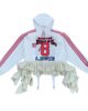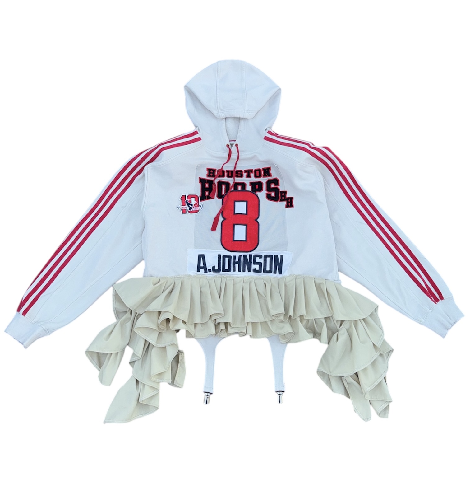Upcycled unisex hoodie adorned with ruffles, patches and garter, creating and a unique, one-of-a-kind piece.