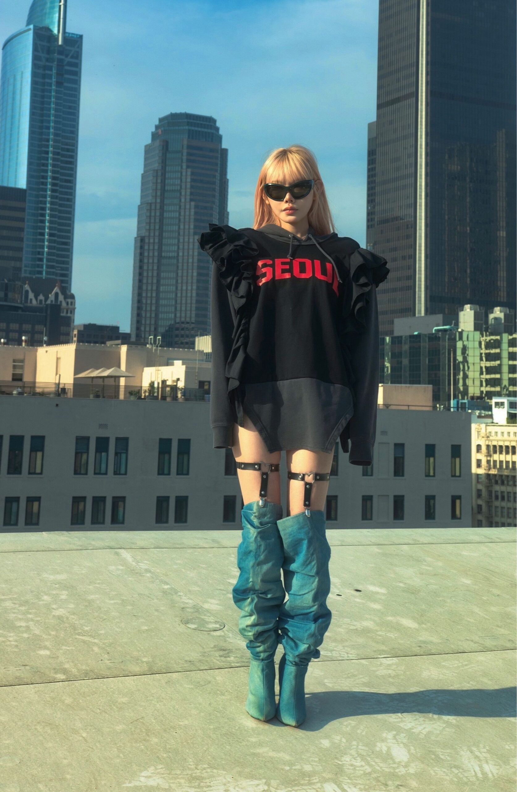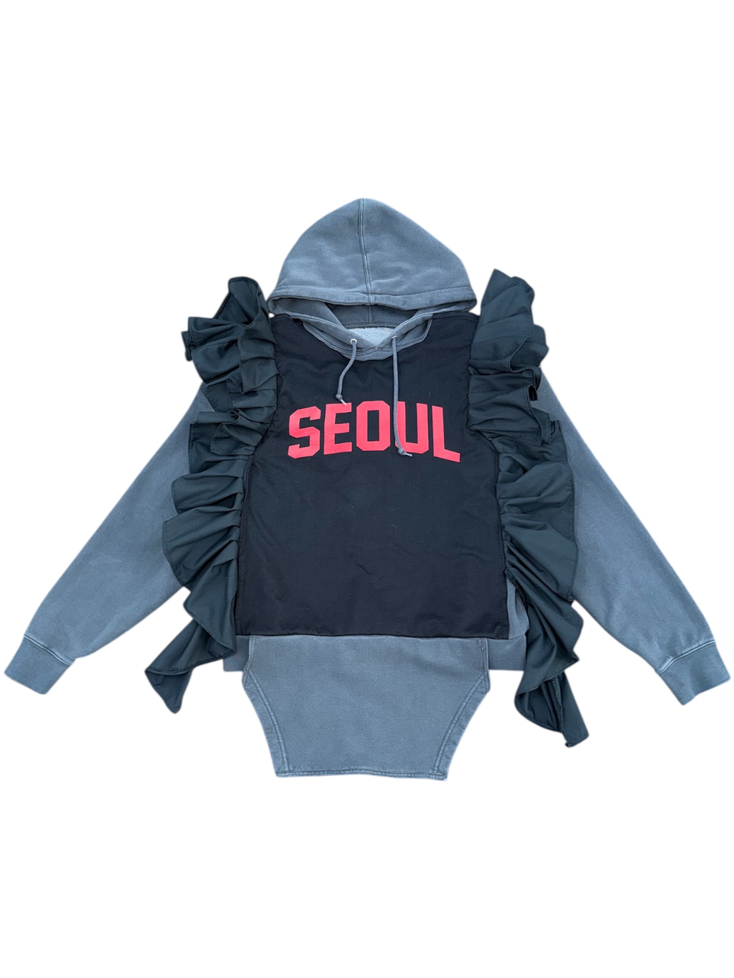 Upcycled unisex hoodie adorned with ruffles, creating and a unique, one-of-a-kind piece.