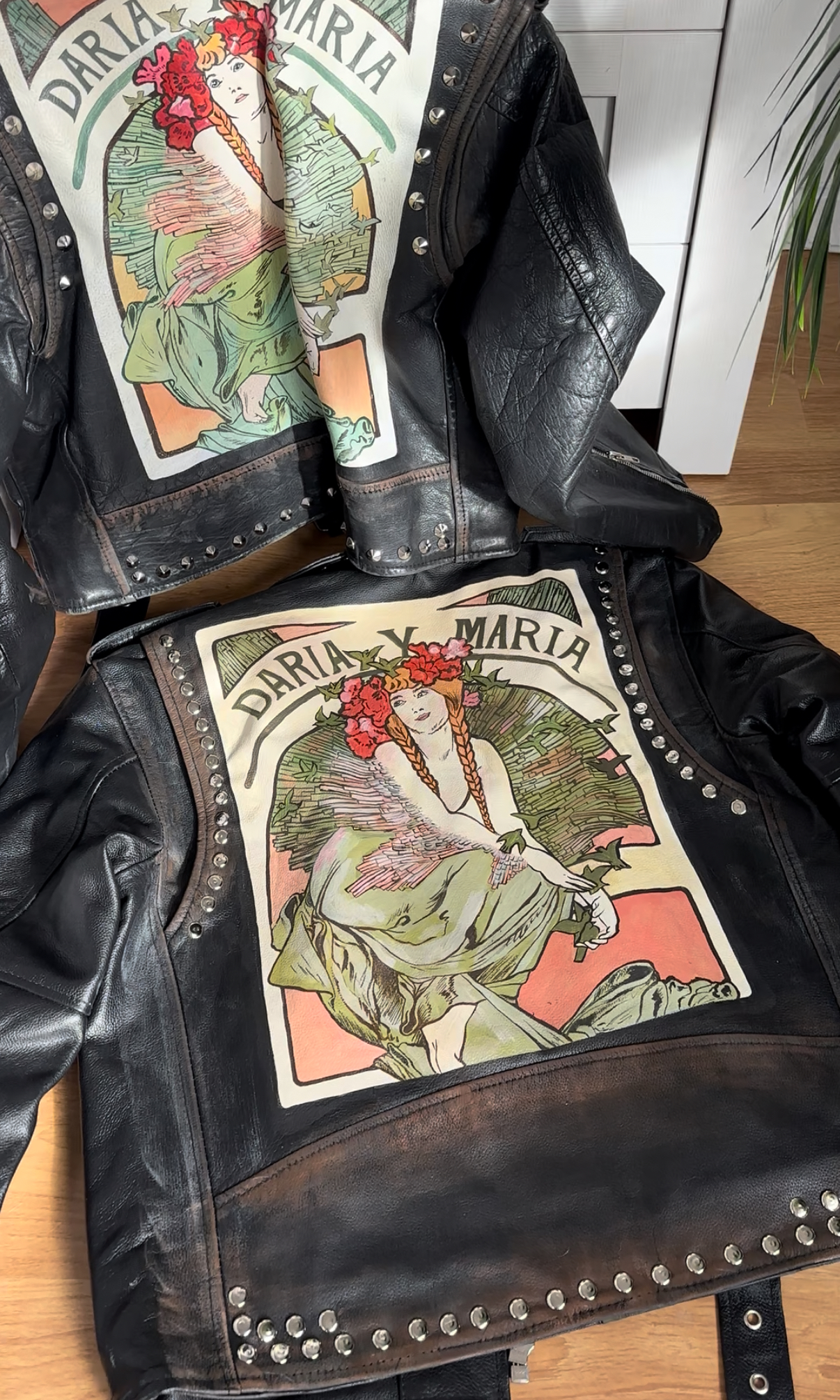We paint on leather jackets the exact copies of a great Art Nouveau period artist Alfons Maria Mucha.