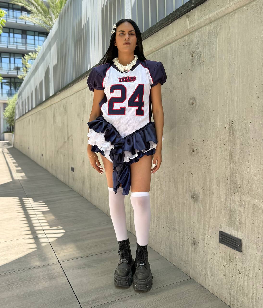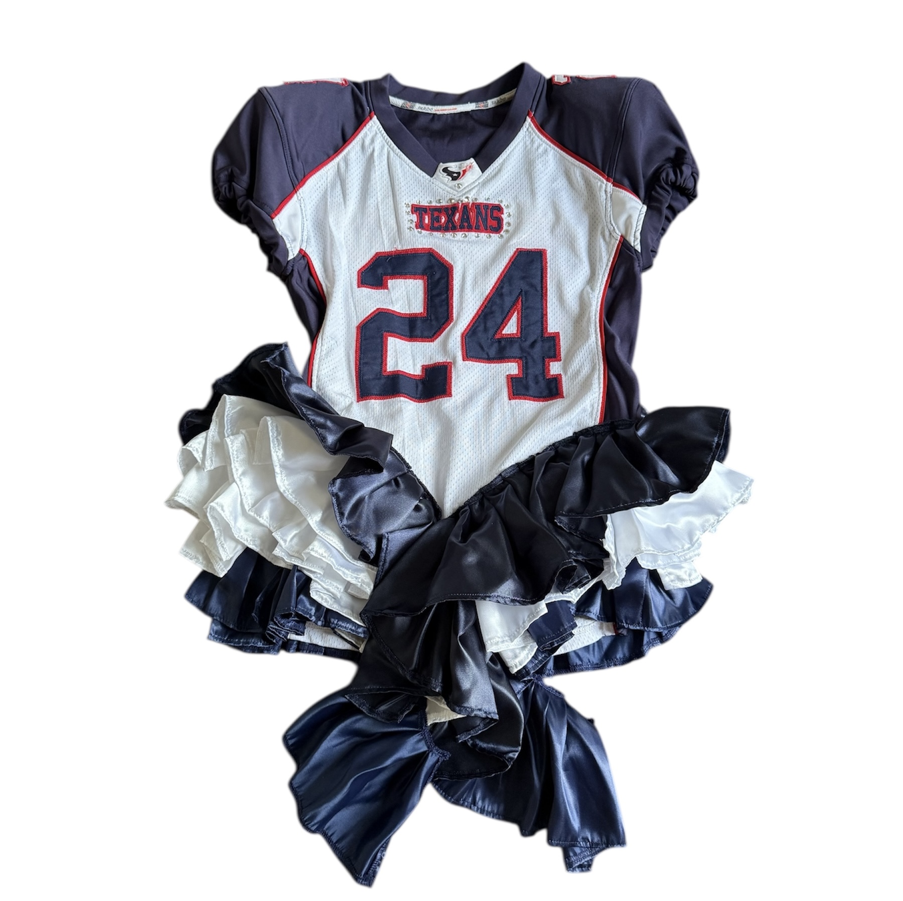 As we produce dresses from vintage jerseys, each dress is unique. There may be a slight difference in the fabric and player name.