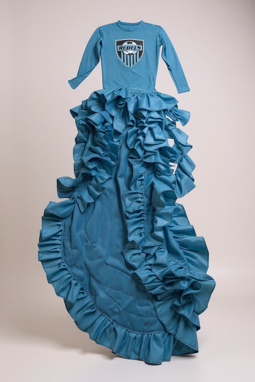 Vintage jersey that has been upcycled into the dress and adorned with ruffles, creating a unique, one-of-a-kind piece.