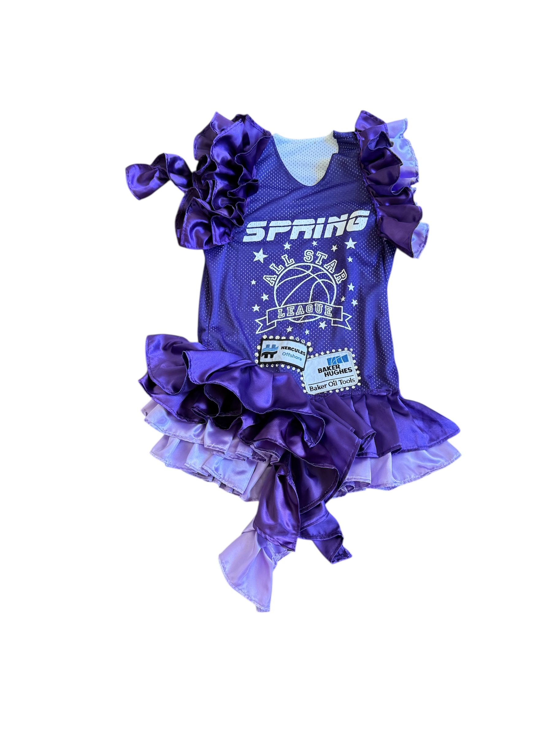 Vintage football jersey dress decorated with ruffles, rhinestones and patches.